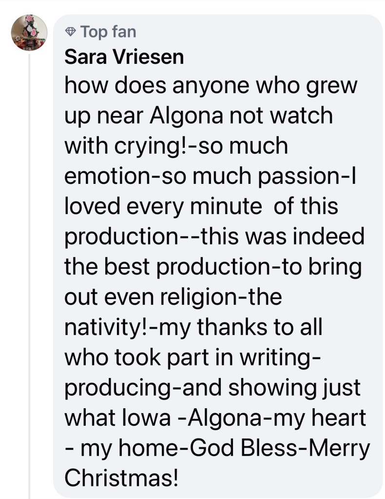 SILENT NIGHT IN ALGONA – We’ve signed a theatrical deal with Dreamscape Productions to book our WW2 holiday film back into theaters due to the demand. We’re also working with them to get the film (and others) out to military base theaters. I do know the Fridley theater in Algona will run the film Dec 6-12th and it is the remastered best version of the film. The first run we were rushed by early dates given by the theater and so the VFX were not at 100% and now they are. Those who don’t want to brave the outdoors can still watch the film on TV (UpTV) or various streaming platforms. It will go to ad-based streaming like Tubi and such summer of 2025. Check with your local theater and if they are not running it request it. It is a wonderful watch on the big screen.