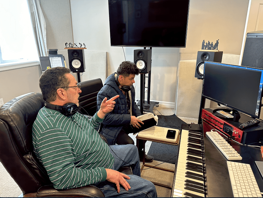 (Composer Dennis Therrian and Director Carl Weyant working on ‘Harsens’)